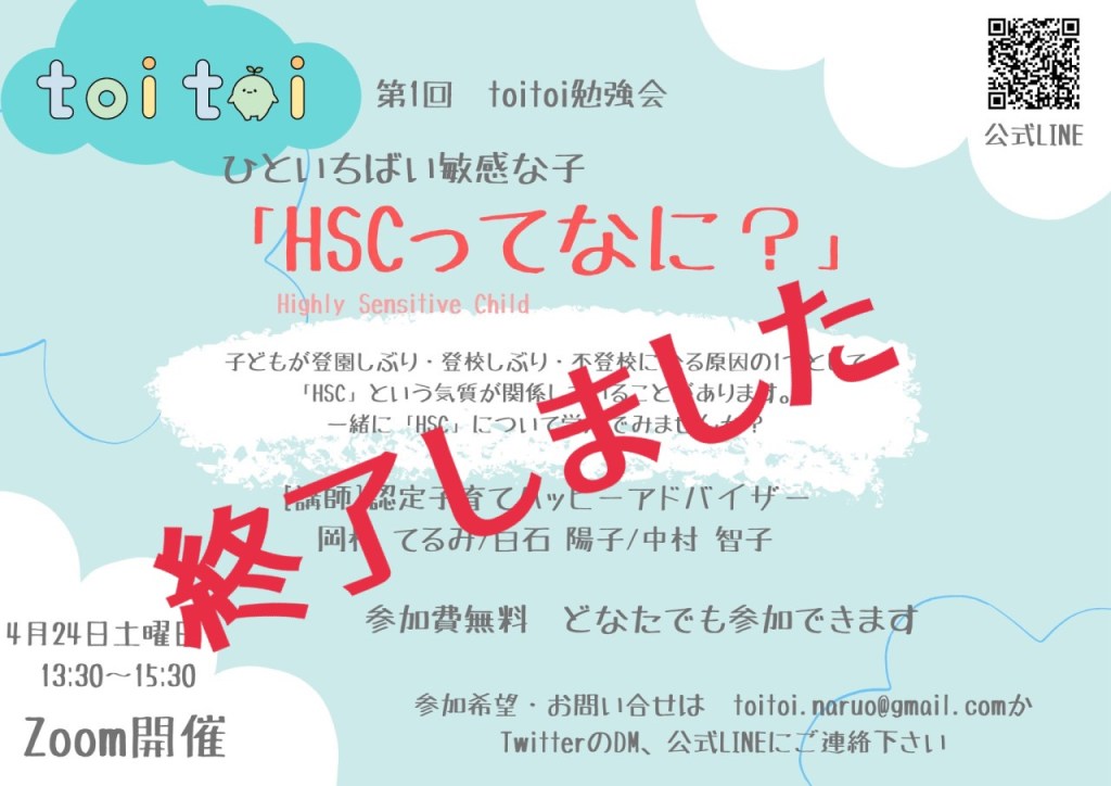 緊急事態宣言発令前より企画していた勉強会。第1回目の勉強会(zoom)は、ひといちばい敏感な子「HSC」ってなに?