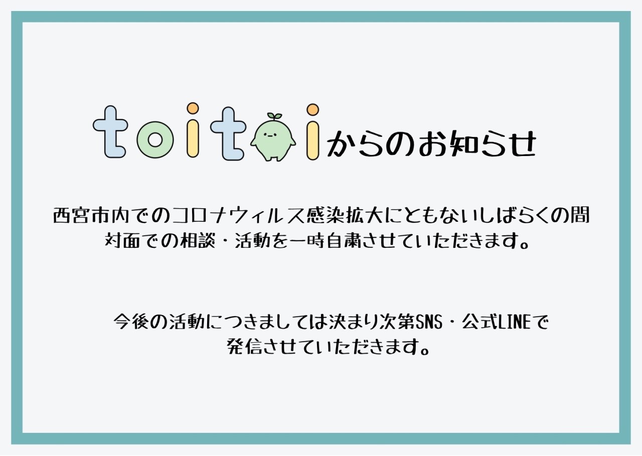 西宮市内でのコロナウィルス感染拡大に伴いしばらくの間対面での相談・活動を一時自粛させていただきます。