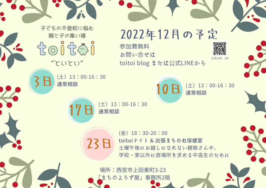 12月のtoitoi開室日は、3日、10日、17日(土)13:00-16:30と