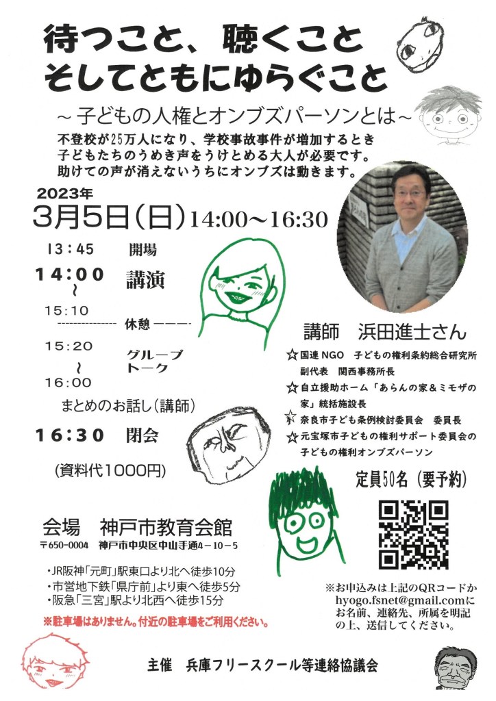 こちらはフリースクールや不登校の親の会の団体が開催します。浜田進士さんを招いての第3者の関わりについて知ることができます。