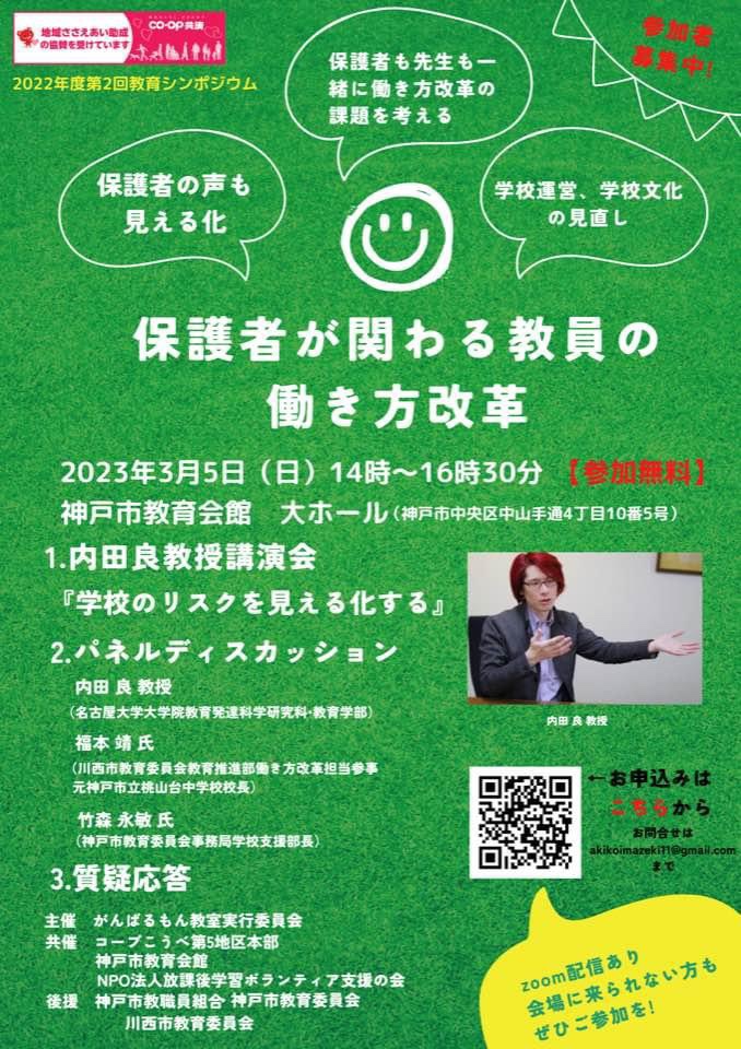 保護者の立場からPTA改革に携わった今関さんの団体と教職員組合、コープさんが共催。学校現場の困り事や問題を具体的にどうしていけばいいか、TVでも出ている内田良さんを迎えての講演会です。