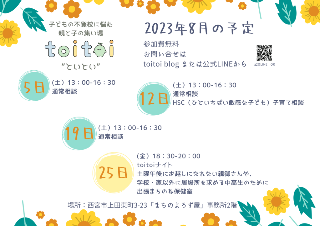 通常の日時に相談にお越しになれない親御さんや、学校・お家以外に居場所を求める中高生の為の開催です。